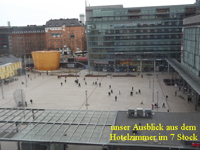 Unser Kurzurlaub begann Dienstags Nachmittags nach der Arbeit. Da wir diesmal von Düsseldorf flogen und dies Morgens Früh, hatten wir uns in Düsseldorf (Airport-Hotel in Hatingen) ein Zimmer gebucht. Hier hatten wir eine Nacht im 4 Sterne Hotel mit Parkplatz und Transfer zum Flugplatz für 3 Personen für unter € 100,00 bekommen. Bevor wir ins Hotel fuhren machten wir noch einen Stopp auf der Königsallee in Düsseldorf wo unsere Nichte unbedingt Abercrombie & Fitch (einziges Geschäft in Deutschland) besuchen musste. Nach einer erholsamen Nacht im Hotel fuhren wir dann am Mittwochmorgen ausgeruht mit dem Taxi (im Hotelpreis enthalten) zum Flughafen wo wir auch direkt unsere Koffer los wurden. Pünktlich startete unsere Maschine Richtung Finnland und nach 2 Stunden Flug landeten wir in Helsinki. Wir nahmen den Bus in die Innenstadt der € 4,50 pro Person kostete. Nach rund 35 min waren wir am Hauptbahnhof von Helsinki wo auch unser Hotel sein sollte. Dies suchten wir dann und erlebten eine Überraschung. Im Hotel angekommen war kein Zimmer für uns reserviert obwohl wir einen Voucher vom Reiseveranstalter hatten. Nach einigen Diskussionen in Englisch stellte uns das Hotel doch ein Dreibettzimmer zur Verfügung und sie fanden den Fehler nachher in der Übermittlung zwischen ihrer Zentrale und dem Hotel. Das Zimmer war super mit einem wunderschönen Ausblick. Um das Hotel herum waren jede Menge Geschäfte was unsere Nichte natürlich freute. Wir begann auch direkt nachdem wir das Gepäck im Hotelzimmer verstaut hatten mit der Erkundung der näheren Umgebung und gingen Shoppen.