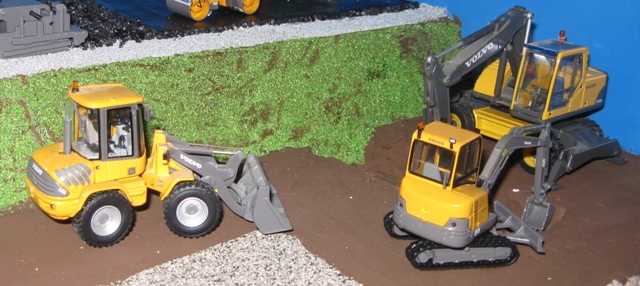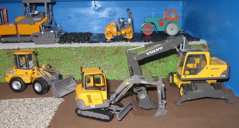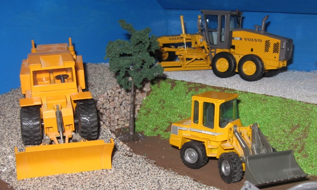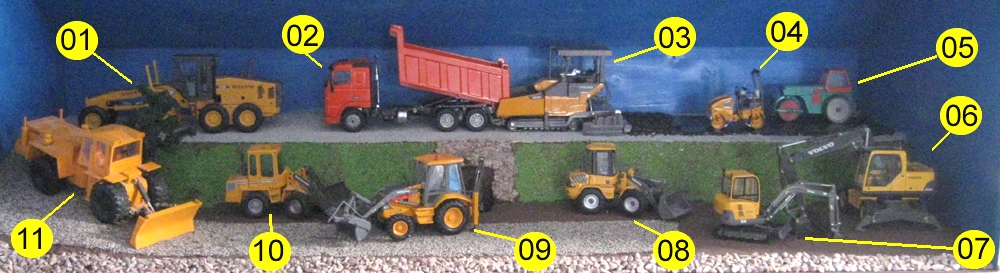 In den letzten Jahren haben sich einige Baumaschinenmodelle im Maßstab 1:50 angesammelt. Bei den Modellen handelt es sich ausschließlich um Zettelmeyer- und Volvo Modelle. Um sie besser zu präsentieren habe ich Landschaften gefertigt wo die Baumaschinen bei der Arbeit zu sehen sind. Die technischen Daten zu den einzelnen Maschinen finden sie ebenfalls hier. Bitte klicken sie auf die Nummern im Übersichtsbild und ein Fenster mit dem Bild der Maschine und den technischen Daten wird sich öffnen. Weitere Landschaften werden folgen da ich noch mehr Modelle besitze.