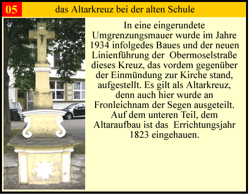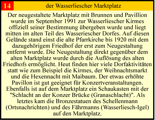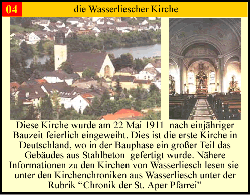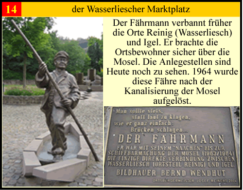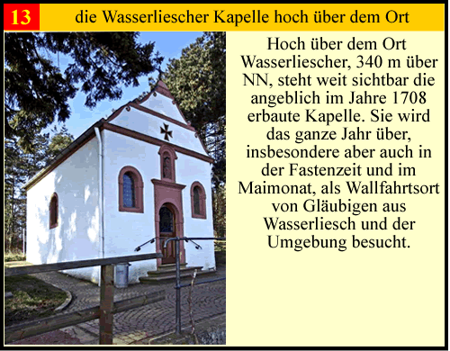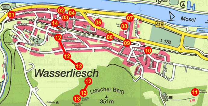 Die Moselgemeinde Wasserliesch hat eine über 1000 jährige Geschichte. Dadurch gibt es viele kleinere und grössere Denkmälern. Es gibt von unter anderem einige Bildstöcke, Altarkreuze und Kapellen. dann gibt es noch den Stationenweg der zur Kapelle führt und die Kirche die das Sehenswerteste ist. Für einen kleinen Ort gibt es viel zu sehen. Wenn sie die Moselgemeinde mal besuchen hoffe ich das sie einen Rundgang machen können und ihnen diese kleine Beschreibungen helfen. Viel Spass in der Moselgemeinde Wasserliesch dem Tor zur Obermosel am Fluß der Geschichte. Bitte klicken sie auf die Zahlen in der Karte und sie kommen zu den Beschreibungen.